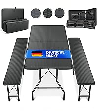 Wir besitzen noch eine klassische Holzbierbank , diese bei Feiern aus dem Keller zu wuchten wird im Alter immer schwerer , daher habe ich mir diese klappbare Variante besorgt .Der Tisch und die Bänke sind bereits komplett vormontiert hier , auspacken , aufstellen , hinsetzen . Der Aufstellmechanismus besitzt einen gut sichtbaren roten Kippschalter , auf dem auch ein offenes Schloß und geschloßenes Schloß angezeichnet ist damit man weiß wie man den Schalter betätigen soll .Das Ausklappen der Füße klappt einfach , hier gibt es einen integrierten , ovalen Metallring der das unbeabsichtigte zusammenklappen verhindert .Der Tisch besitzt eine gute Breite , hier kann man wunderbar essen auch mit großen Tellern . Die Sitzbank finde ich etwas gering von der Höhe her , aber nur marginal . Die Rattanoptik finde ich sehr schön und edel wirkend .Was man beachten sollte ist das hier Kunststoffgeflecht verwendet wird , heiße Asche von Zigaretten , oder Kerzen sollte man mit bedacht hier anwenden . Auch dauerhaftes im Sonnenschein stehen lassen , wird wahrscheinlich dazu führen das das Kunststoffgeflecht spröde wird durch die UV Strahlen , von daher immer nachdem einsatz schön wegpacken .Schön finde ich auch die gute Verstaubarkeit , diese kann man auch bequem im Auto mitführen ohne Probleme .Von mir ein empfehlenswert für Gartenfeiern , leicht verstaubar , und solides Grundgerüst , dazu leicht auf und wieder abzubauen .